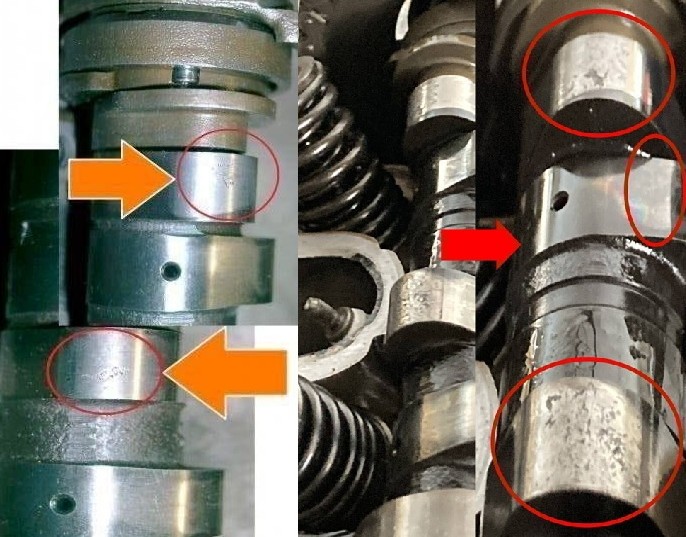 潤滑低下によるカムシャフトの各カジリ症状